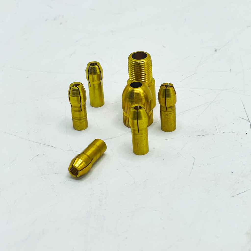 کولتها (Collets): آن ۵ یا ۶ قطعه باریک و شیاردار، «کولت» نام دارند. هر کدام برای یک بازه مشخص از قطر مته ( از ۰.۵ تا ۳.۲ میلیمتر) طراحی شدهاند.